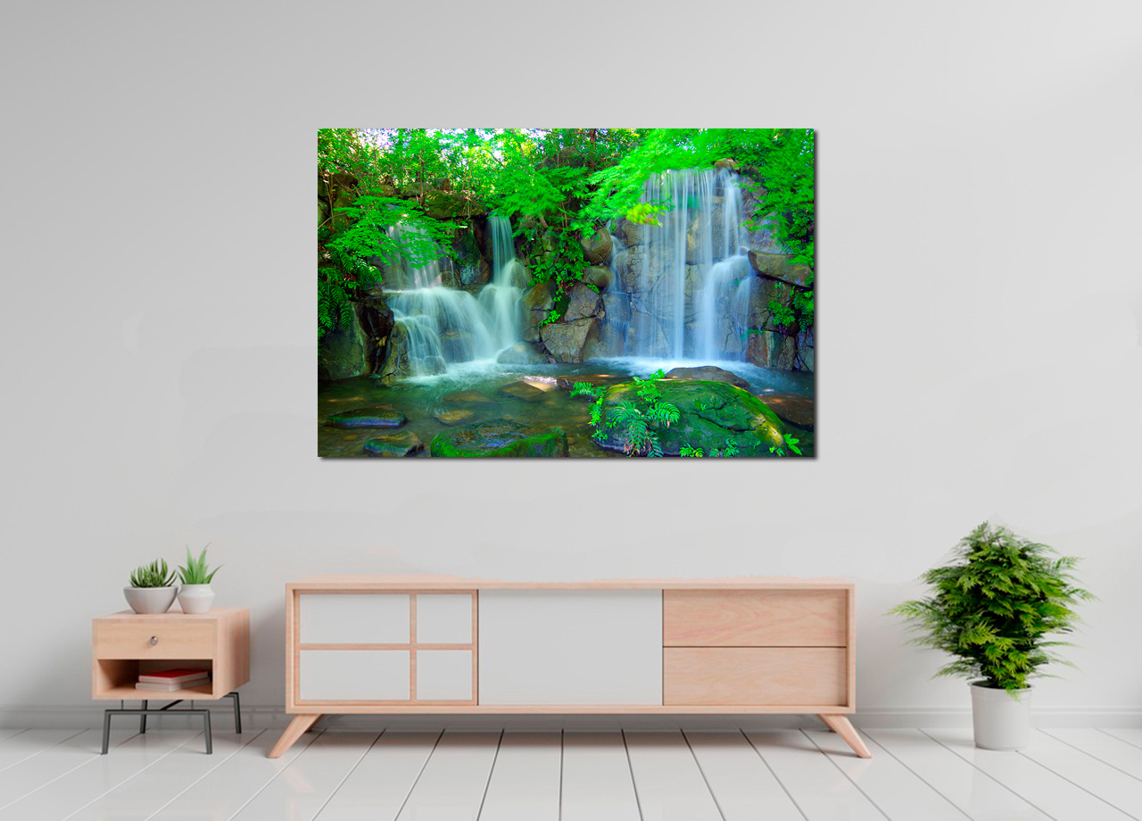 Cuadro paisaje cascada impreso sobre tela de lienzo, espectacular imagen donde la belleza exuberante del entorno trasmiten una sensación de paz refrescante, relajación y entorno idílico. Ideal para decorar espacios representativos de su hogar.