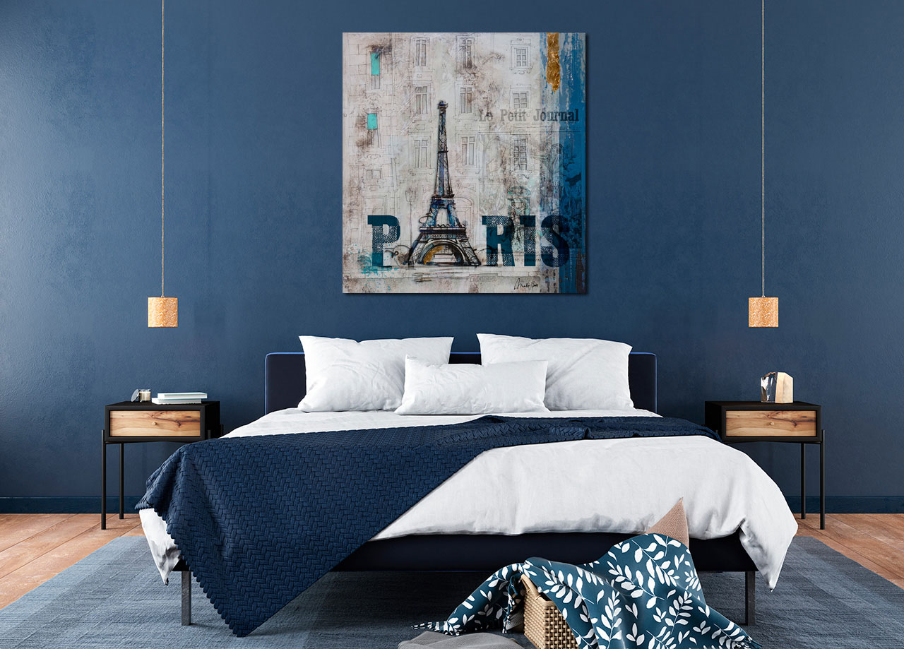 Cuadro Paris impreso sobre tela de lienzo, retocado a mano y pintando zonas relevantes del mismo por el artista, esta mezcla de materiales es una técnica novedosa que le da un aspecto muy glamuroso a la vez que muy decorativo, este cuadro es ideal para decorar estancias mas relevantes de su hogar, le aportara un toque distinguido y de buen gusto.
