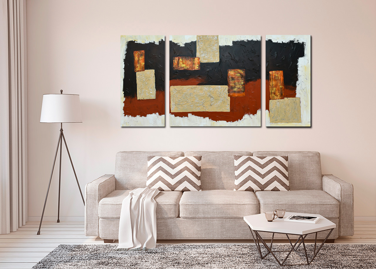 Cuadro tríptico pintado a mano de enorme fuerza y contraste visual, junto con sus texturas y relieves, hacen de este cuadro una pieza de enorme calidad artística. Este cuadro lo mandamos entelado en un bastidor de 3 centímetros de grosor y preparado para colgar sin necesidad de enmarcar.